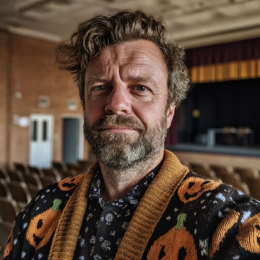 Um homem sorridente vestindo um cardigã cor de abóbora | Fonte: Midjourney