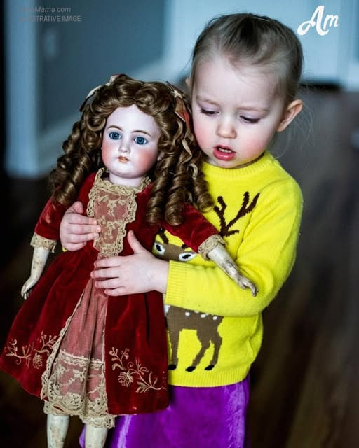 “Ela é linda!”, exclamou Eva, abraçando a boneca com força. “Ela até tem um bebê! Mamãe, olha!”