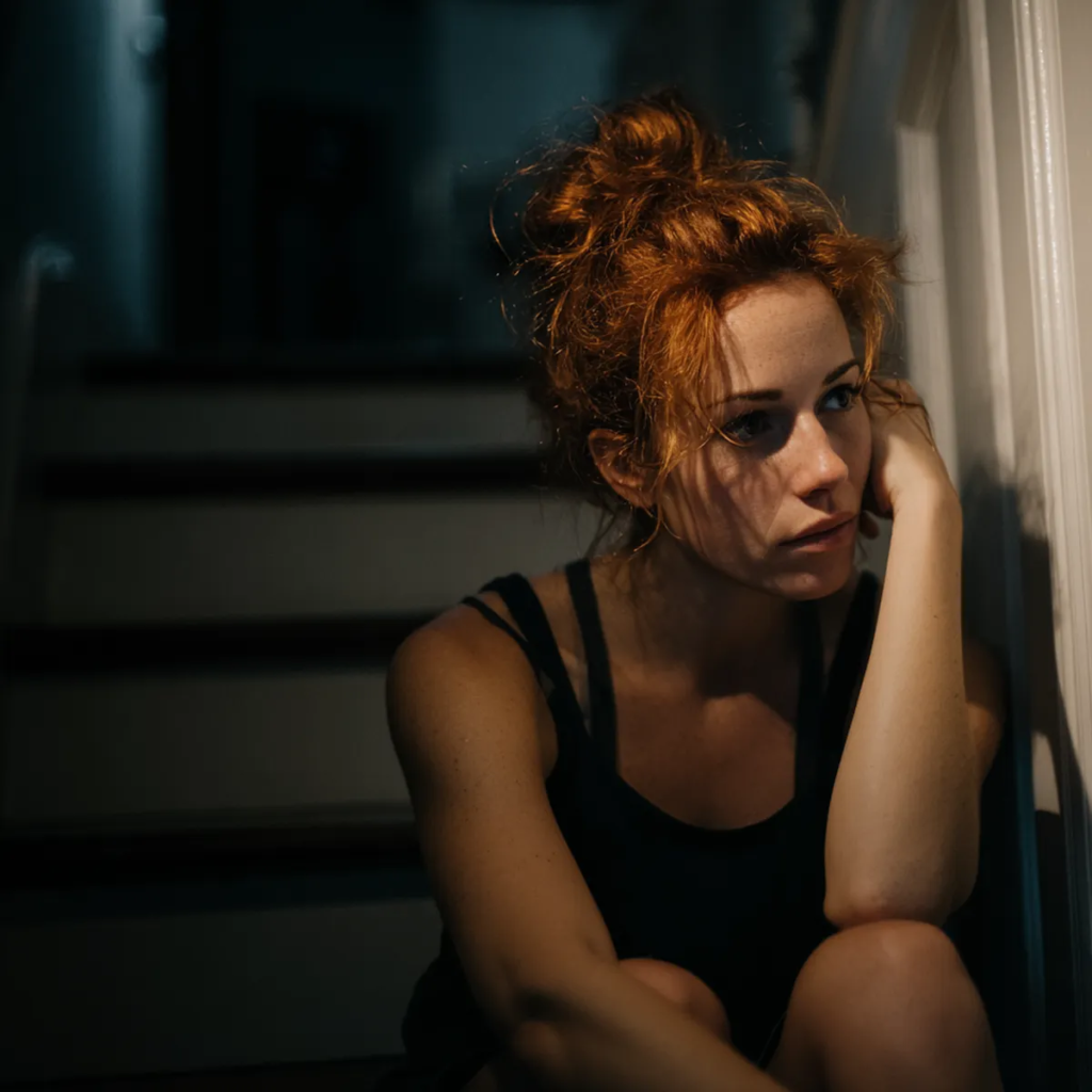 Uma mulher animada sentada em uma escada | Fonte: Midjourney