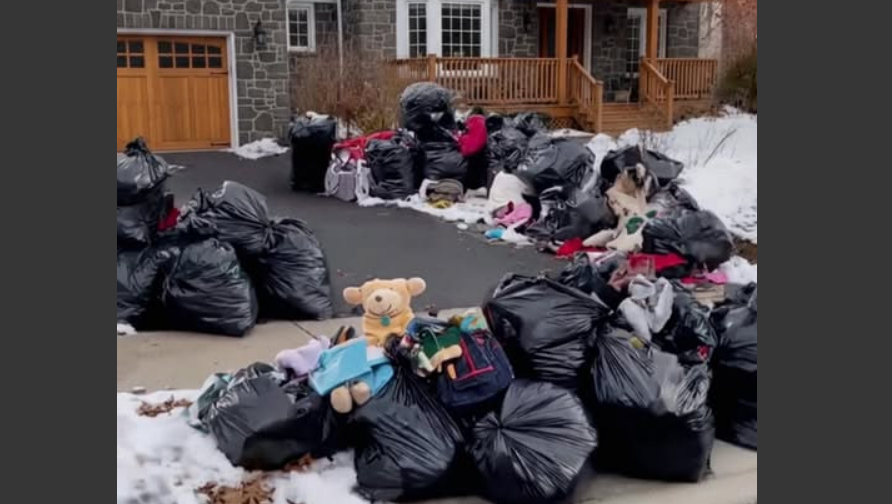 Pertences pessoais descartados em sacos de lixo do lado de fora de uma casa | Fonte: Midjourney