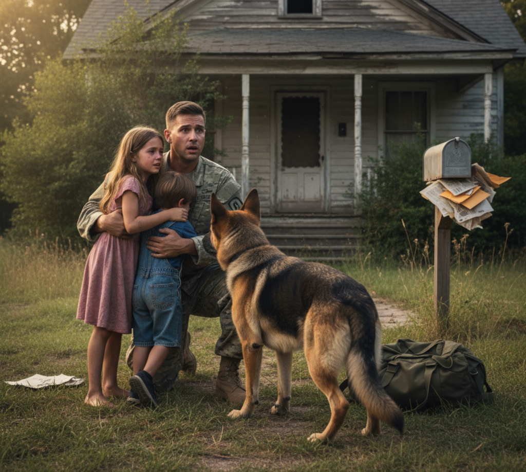 O quintal estava coberto de mato. A caixa de correio transbordava de papéis amarelados. E na varanda estava sentada sua filha de nove anos, Emily, agarrada ao irmão de quatro, Joshua. À frente deles estava seu pastor alemão, Max, com os pelos eriçados, protegendo-os como se estivessem do mundo.