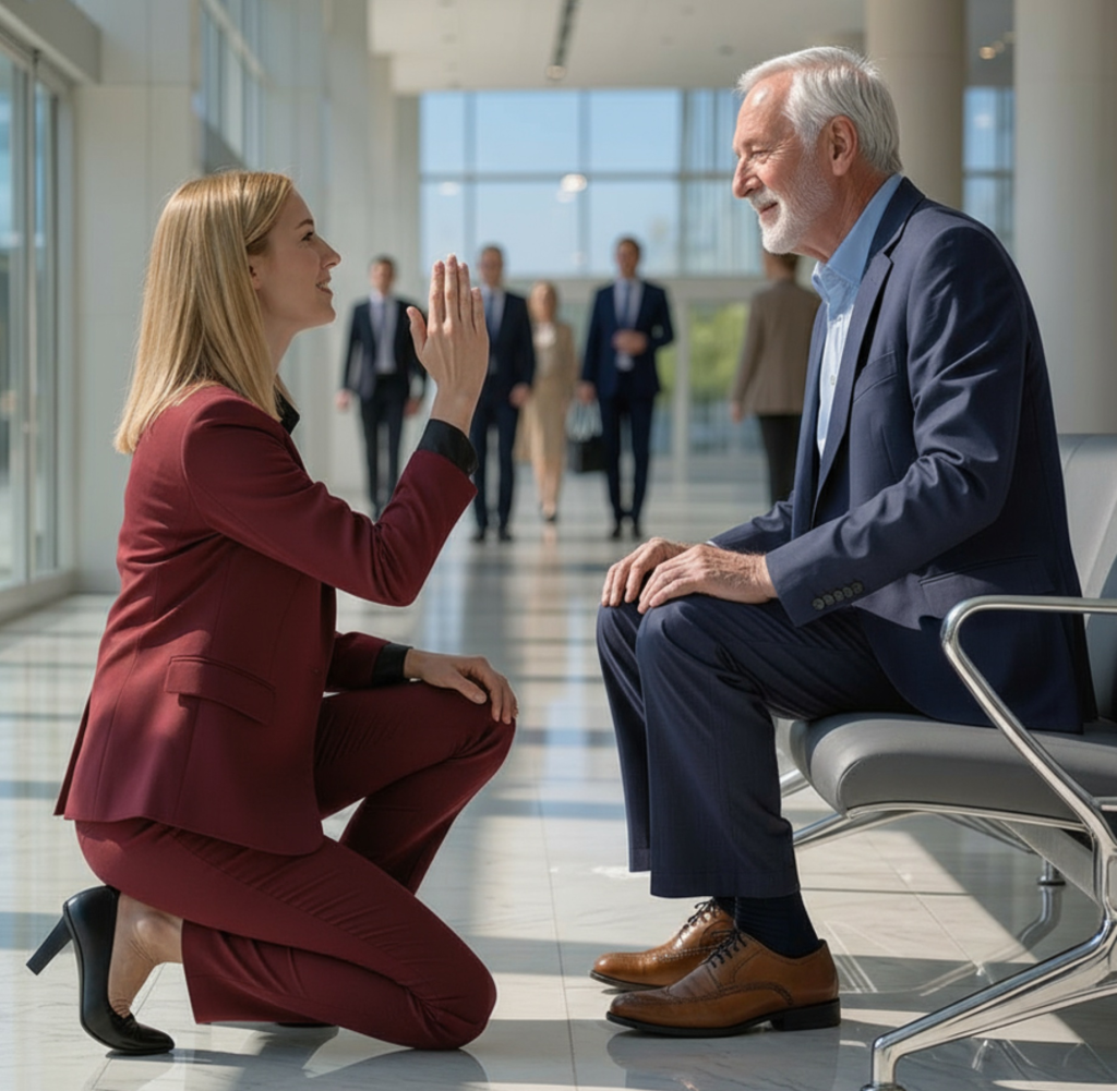 O saguão zumbia — mensageiros, saltos altos, hálito de café expresso, o cheiro de urgência. Catherine estava reunindo os livros de propostas quando um homem mais velho, de terno azul-marinho, aproximou-se da mesa de mármore. Ele sorriu, tentou falar, depois levantou as mãos e começou a fazer sinais.