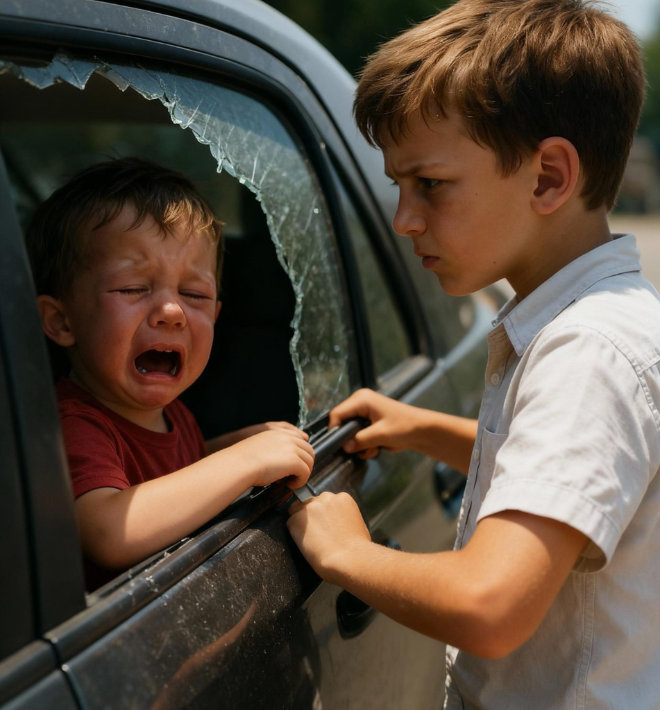 Ao atravessar a rua correndo, algo lhe chamou a atenção. Um carro cinza estava estacionado junto ao meio-fio. Dentro, no banco do passageiro, estava uma criança pequena — não mais velha que seu irmãozinho. A criança chorava, batendo fracamente contra a janela, a voz rouca de tanto gritar por socorro. Suas bochechas estavam vermelhas e sua respiração era curta e irregular. O calor dentro do carro parecia insuportável.