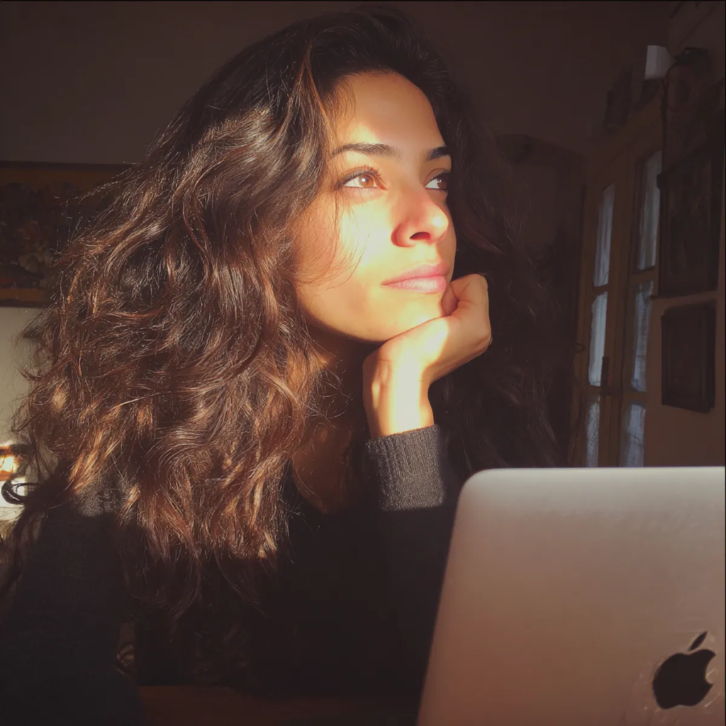 Uma mulher pensativa sentada com seu laptop | Fonte: Midjourney