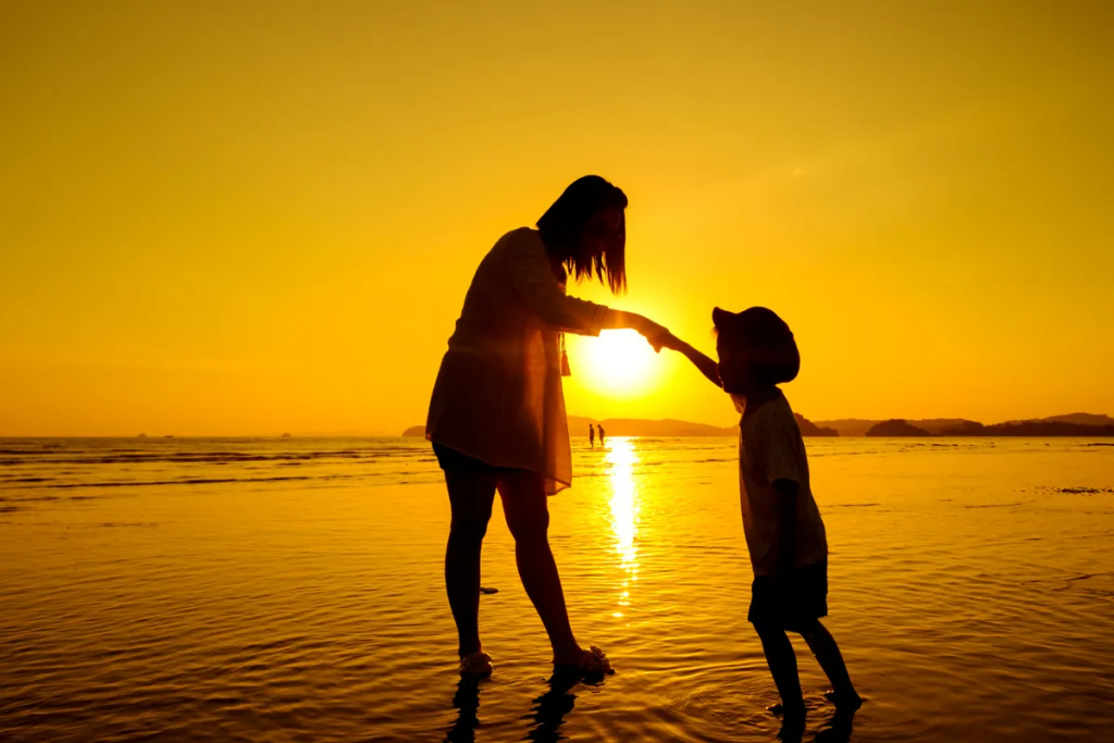 Mãe e filho na praia ao pôr do sol | Fonte: Freepik