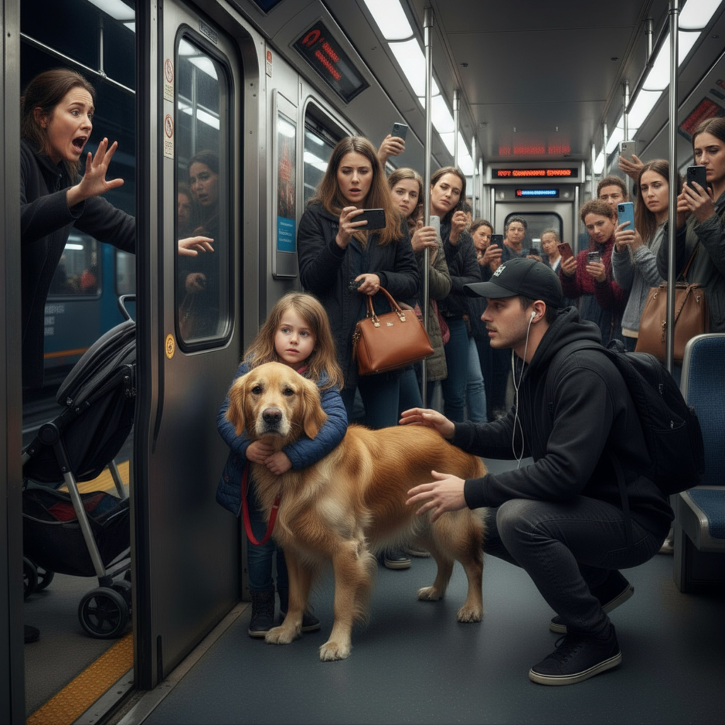 O trem exalou, o sinal tocou e as portas deslizantes se fecharam como um veredicto. De um lado do vidro: uma jovem mãe com um carrinho de bebê dobrado, ofegante, a mão estendida. Do outro: sua filha de olhos arregalados e um golden retriever aconchegados junto aos seus joelhos. O vagão deu um solavanco para a frente. As palmas das mãos da mãe bateram na janela — tarde demais.