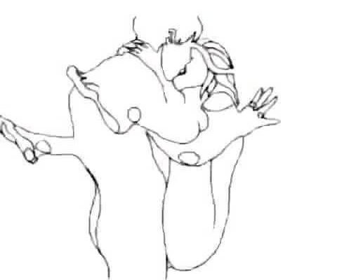 Na cena, o homem abraça a mulher, levantando-a levemente enquanto se beijam apaixonadamente. A perna da mulher envolve o homem, enfatizando a proximidade e o romance. O fundo é desfocado, focando no casal e em sua conexão, enquanto a cama e a iluminação suave contribuem para o ambiente íntimo. O estilo artístico é impressionista, com pinceladas suaves e cores mescladas, realçando a profundidade emocional da imagem.